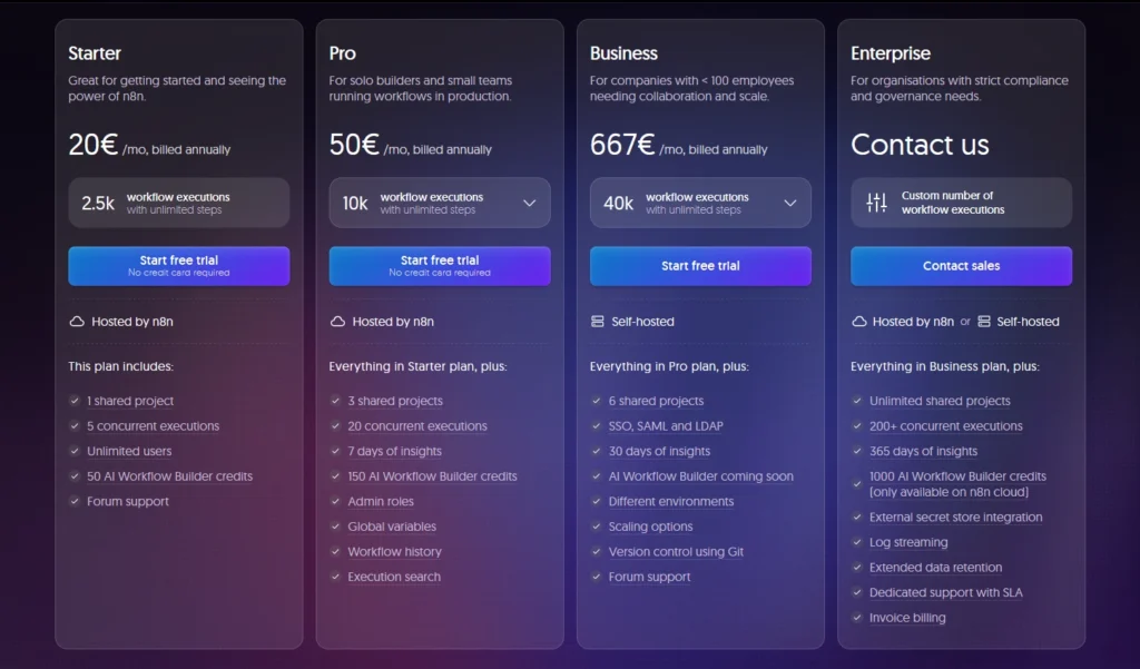 N8N also offers a cloud version with simpler pricing based on workflow executions. This removes the hassle of managing infrastructure whilst still giving you the benefits of N8N’s flexibility. The cloud pricing is generally competitive with Make.com for similar usage levels, though direct comparisons are tricky because the platforms measure usage differently.